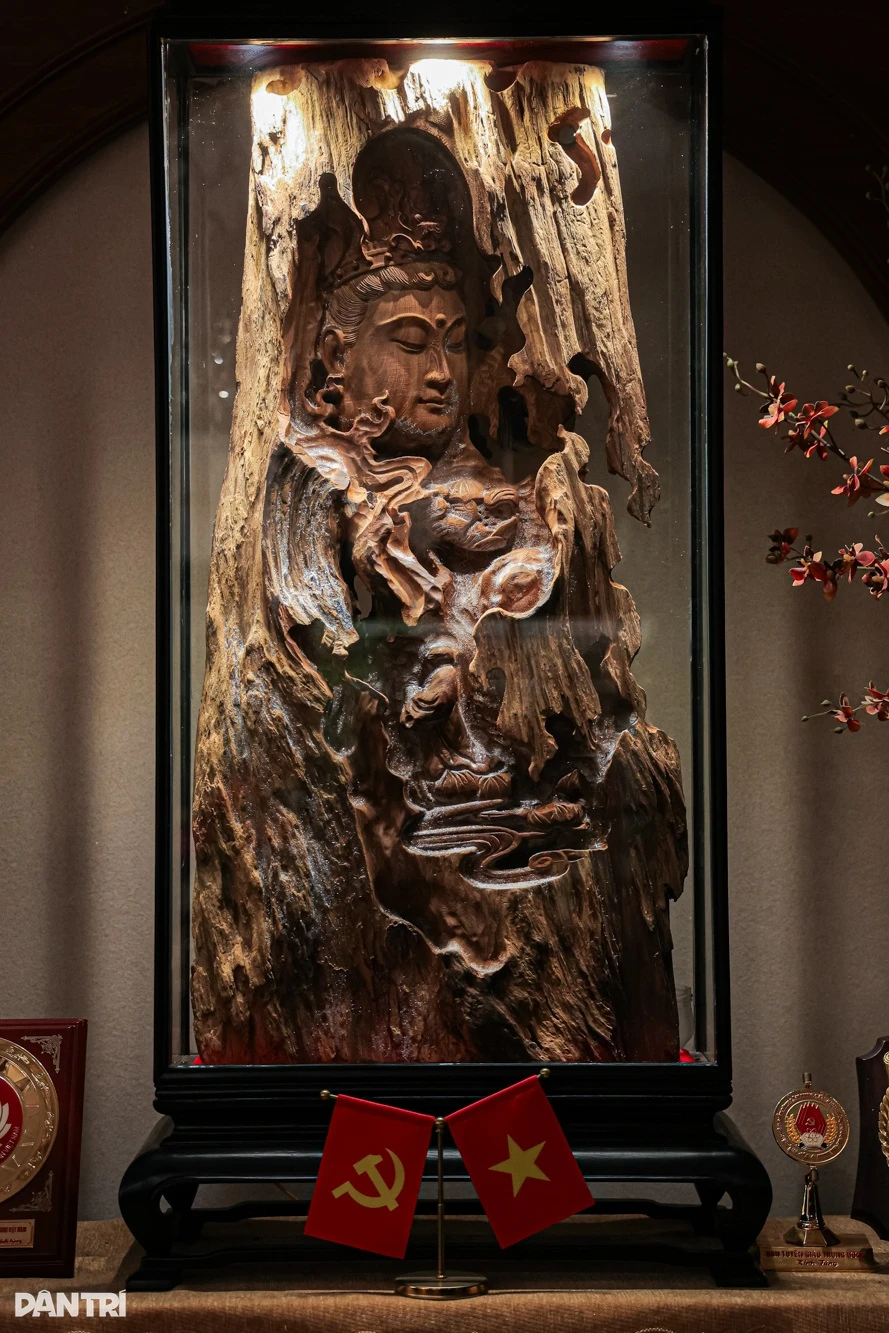 Gần phòng khách, NSND Quốc Trượng đặt bức tượng Phật Bà bằng gỗ Hoàng đàn tuyết Lạng Sơn. Bức tượng được đặt trong một tủ kính, có đèn chiếu rất đẹp khiến bạn bè tới thăm nhà anh đều xuýt xoa.