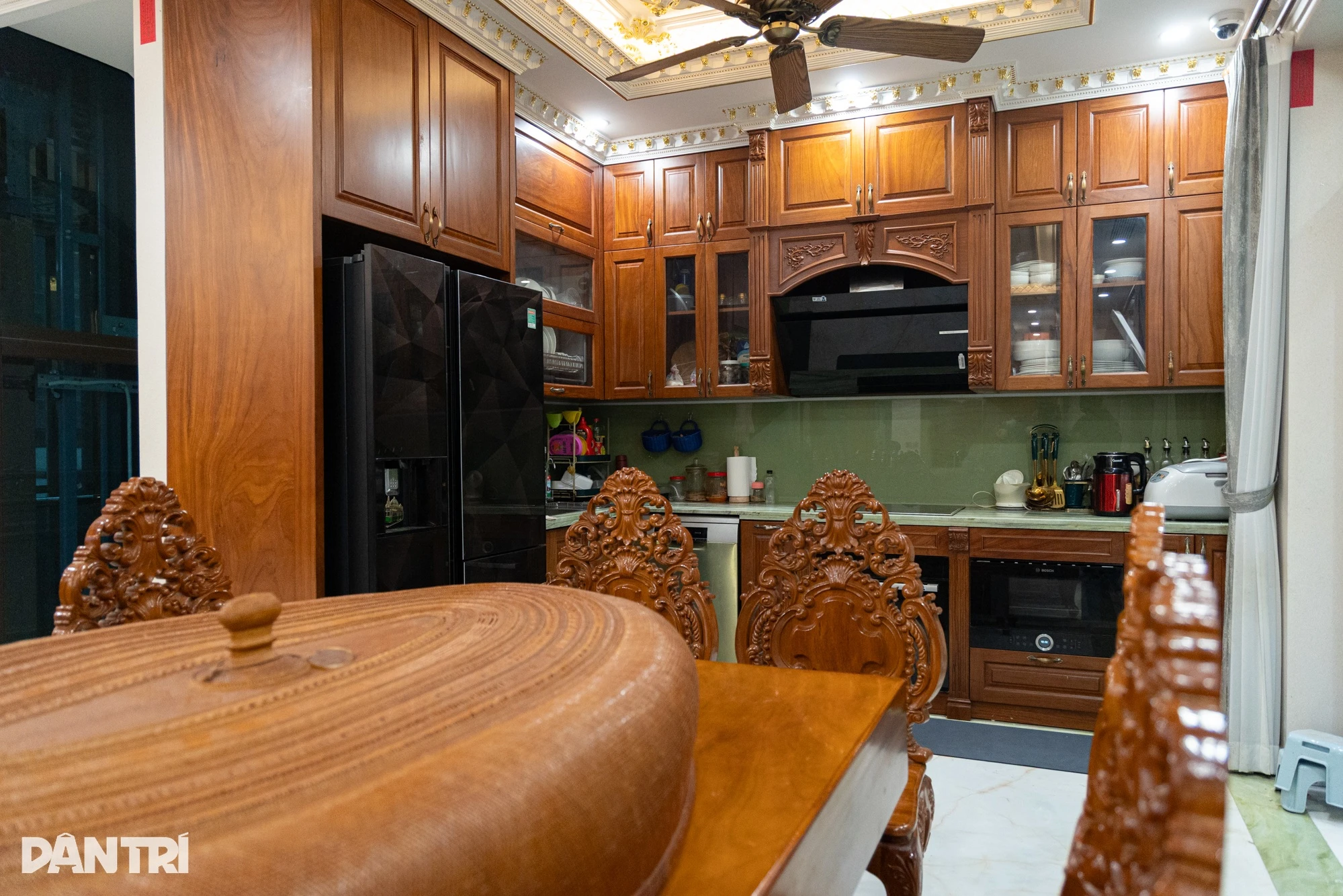 Căn bếp được nam nghệ sĩ được bố trí gọn gàng, sạch sẽ. Điểm nhấn ở khu bếp là chiếc lồng bàn to đan từ mây, được anh đặt riêng cho bàn ăn có diện tích lớn của gia đình.
