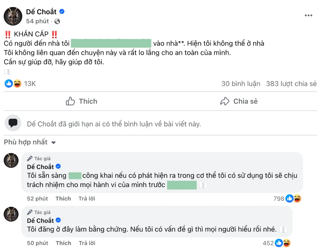 Không dừng lại, tối 29/9, Dế Choắt tiếp tục khiến mạng xã hội náo loạn bằng một dòng trạng thái đề cập sự an toàn của bản thân, giọng điệu quyết liệt như thể sẵn sàng đối mặt mọi tình huống. Sau đó, Dế Choắt xóa dòng trạng thái này. Những phát ngôn gay gắt, cộng với chuỗi động thái khó lường, đã khiến nhiều người ví Dế Choắt như “Chí Phèo của làng rap” – kẻ không còn gì để mất, liên tục gây hấn đồng nghiệp.