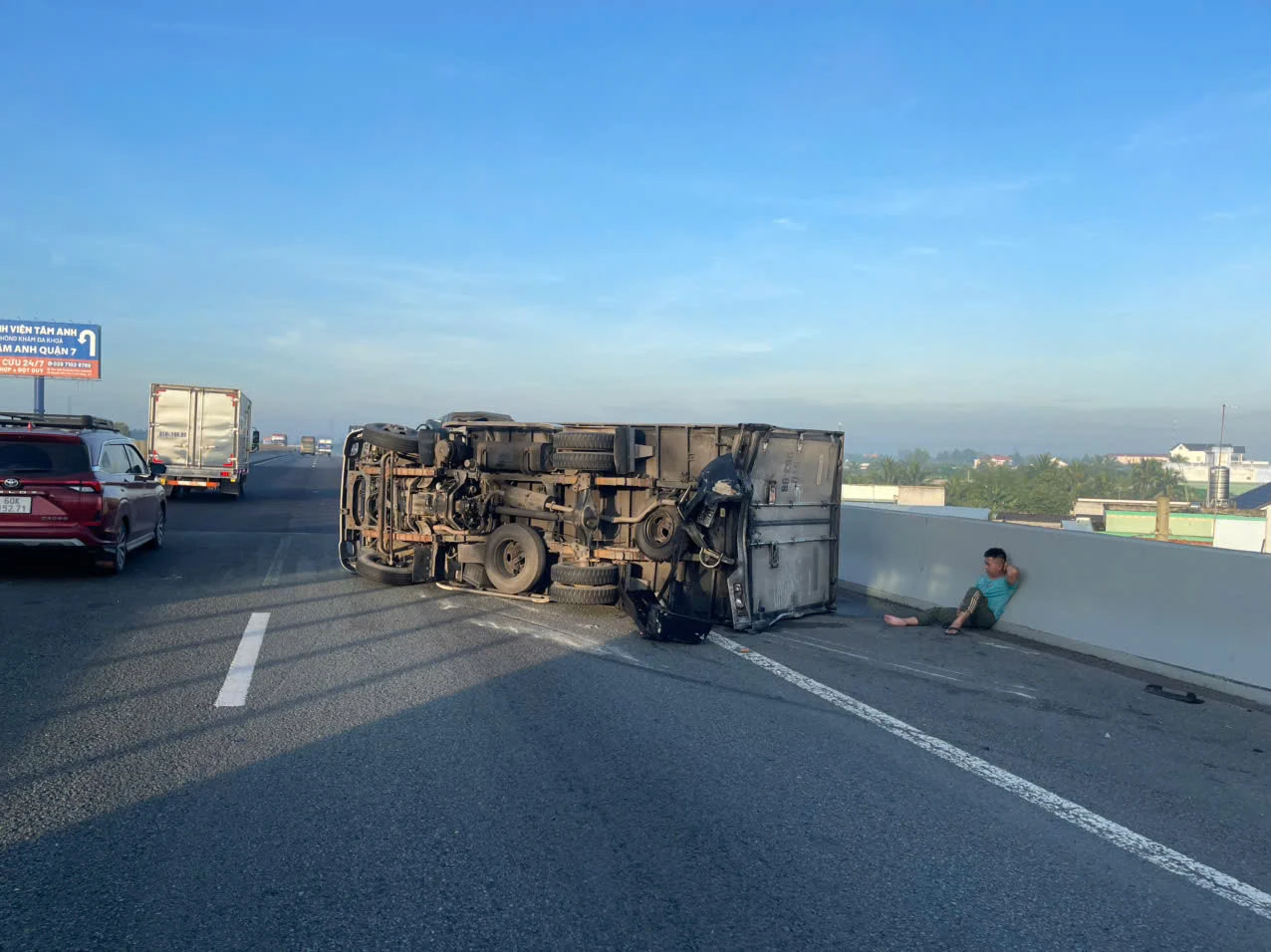 Xe tải lật ngang trên cao tốc. Ảnh: V.T.