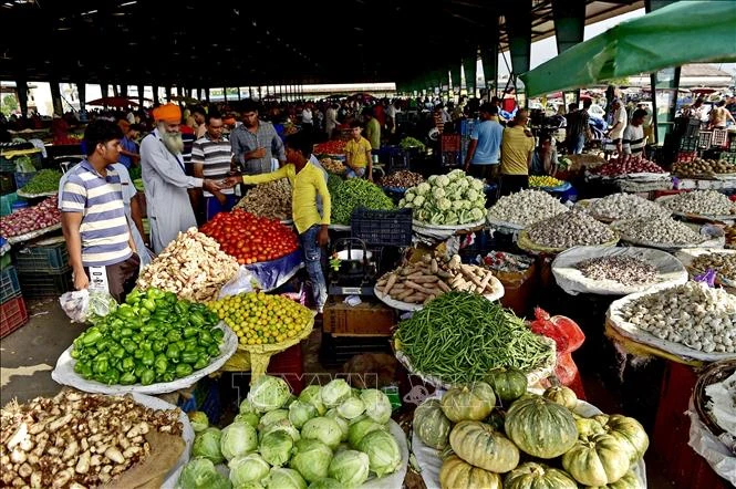 Người dân mua thực phẩm tại một khu chợ ở Jalandhar, Ấn Độ. Ảnh: ANI/TTXVN