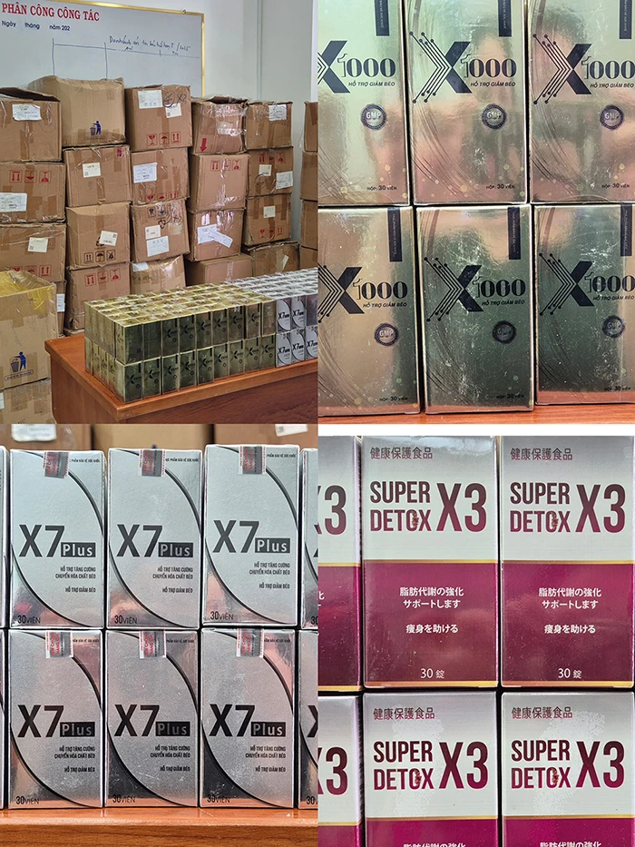 Các sản phẩm thực phẩm bảo vệ sức khỏe (giảm cân) mang thương hiệu Super Detox X3, X7, X1000… bị xác định là không đạt chỉ tiêu chất lượng, hàng giả. Ảnh: CA