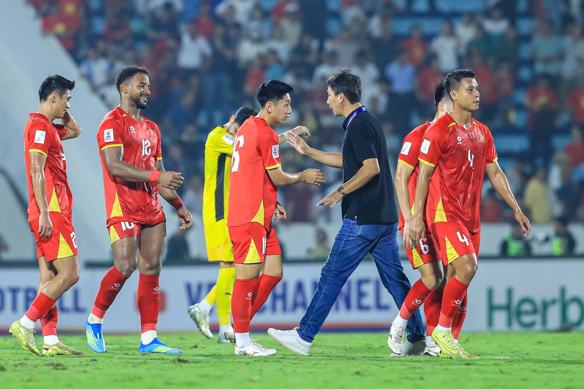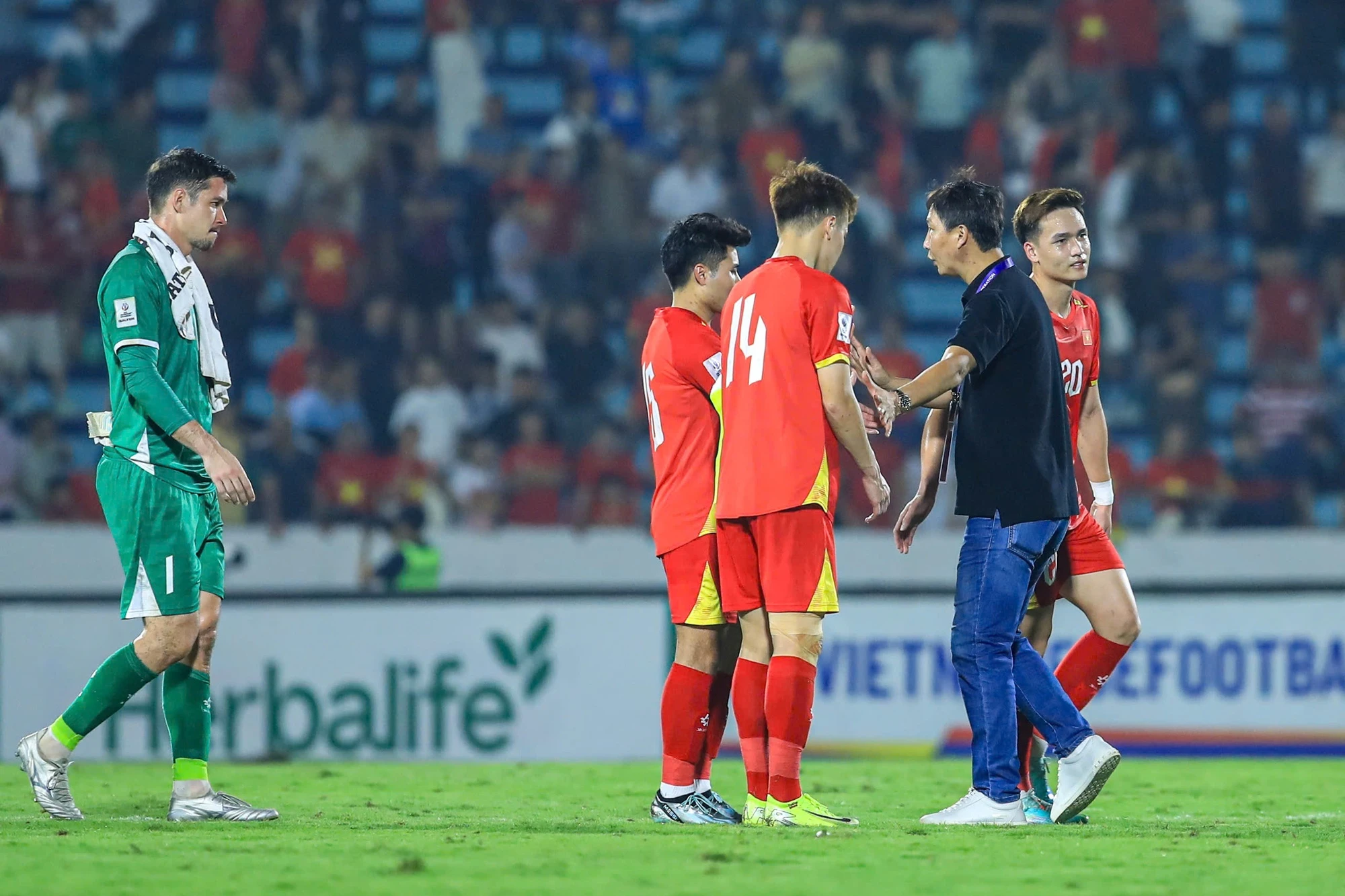 Ngay khi trọng tài thổi hồi còi kết thúc trận đấu HLV Kim Sang Sik đã tiến thẳng vào sân, tìm gặp từng cầu thủ để bắt tay và trao những cái ôm khích lệ