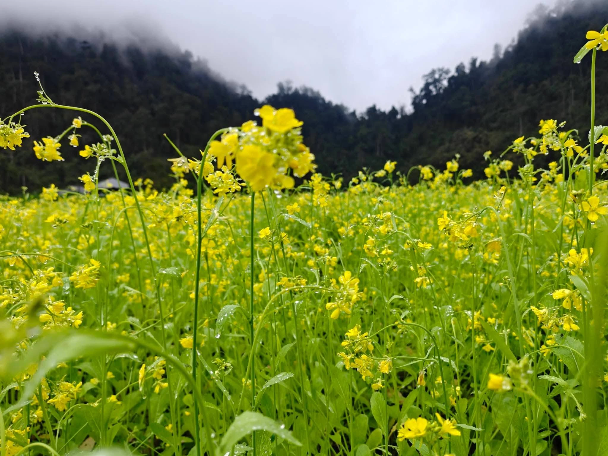 Từ trên cao nhìn xuống, sắc vàng tươi trải dài ngút tầm mắt, hòa quyện cùng làn mây bảng lảng đặc trưng của miền sơn cước tạo nên khung cảnh vừa thơ mộng, vừa trong trẻo giữa tiết xuân vùng cao.
