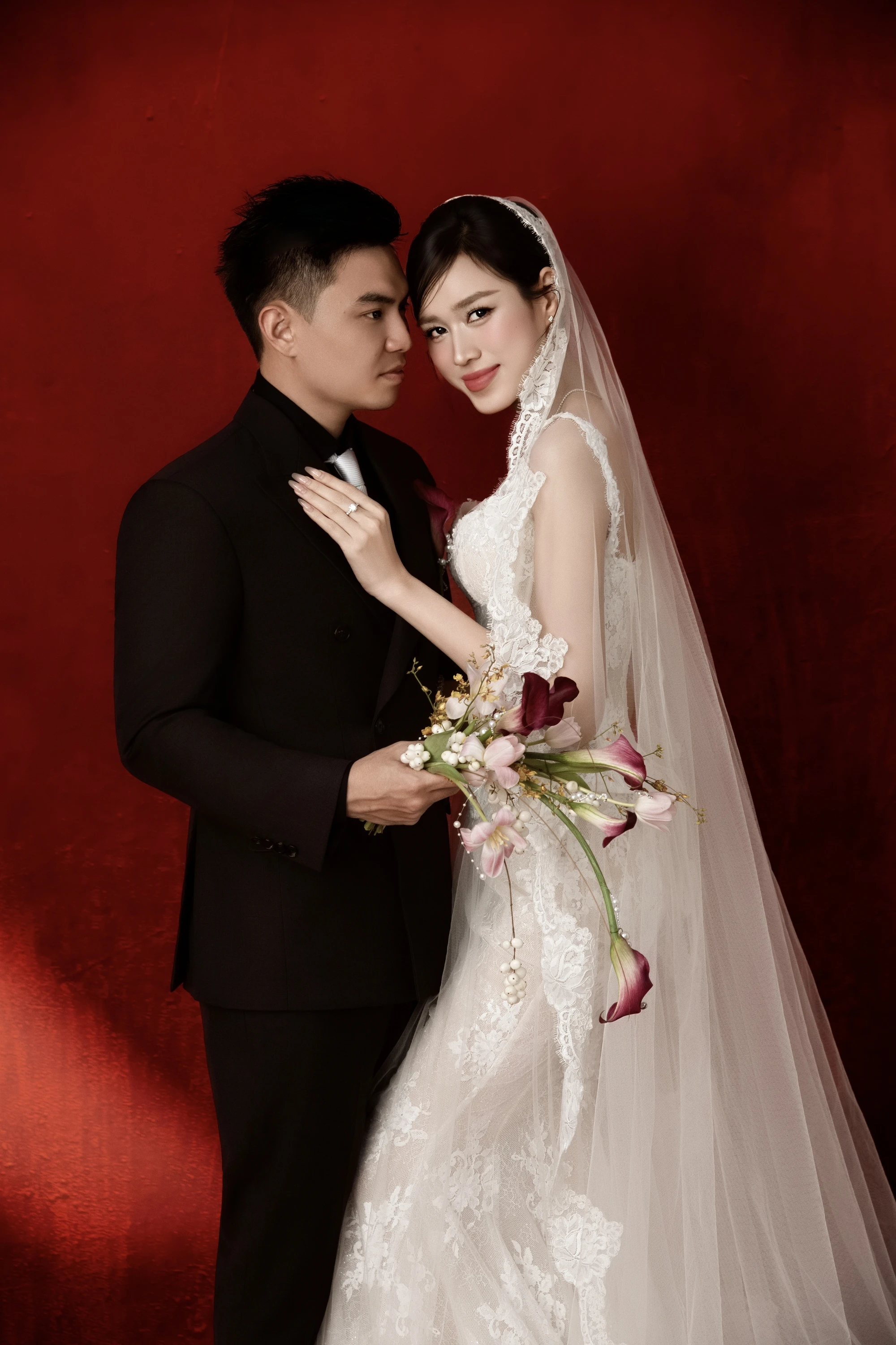 Đỗ Thị Hà gây ấn tượng với bộ váy cưới ren xuyên thấu tinh tế ôm sát cơ thể. Nàng hậu để tóc đính kèm khăn voan dài chấm xuống sàn, tạo vẻ đẹp cổ điển nhưng không kém phần hiện đại. Cô dâu cũng gây chú ý khi ‘dát kim cương’ đắt tiền lên người gồm vòng cổ, hoa tai và nhẫn cưới.
