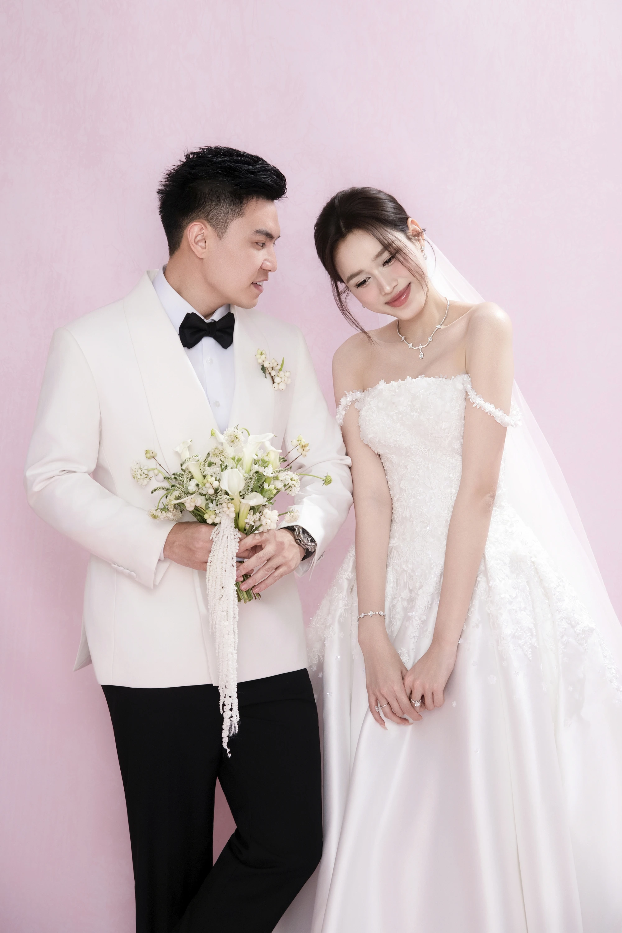 Cô dâu trong thiết kế xuyên thấu, chú rể điển trai trong vest trắng.