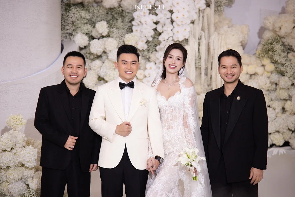 Gương mặt điển trai cùng nụ cười ấm áp, chú rể Viết Vương luôn sát cánh bên cô dâu, nắm chặt tay vợ với ánh mắt trìu mến.