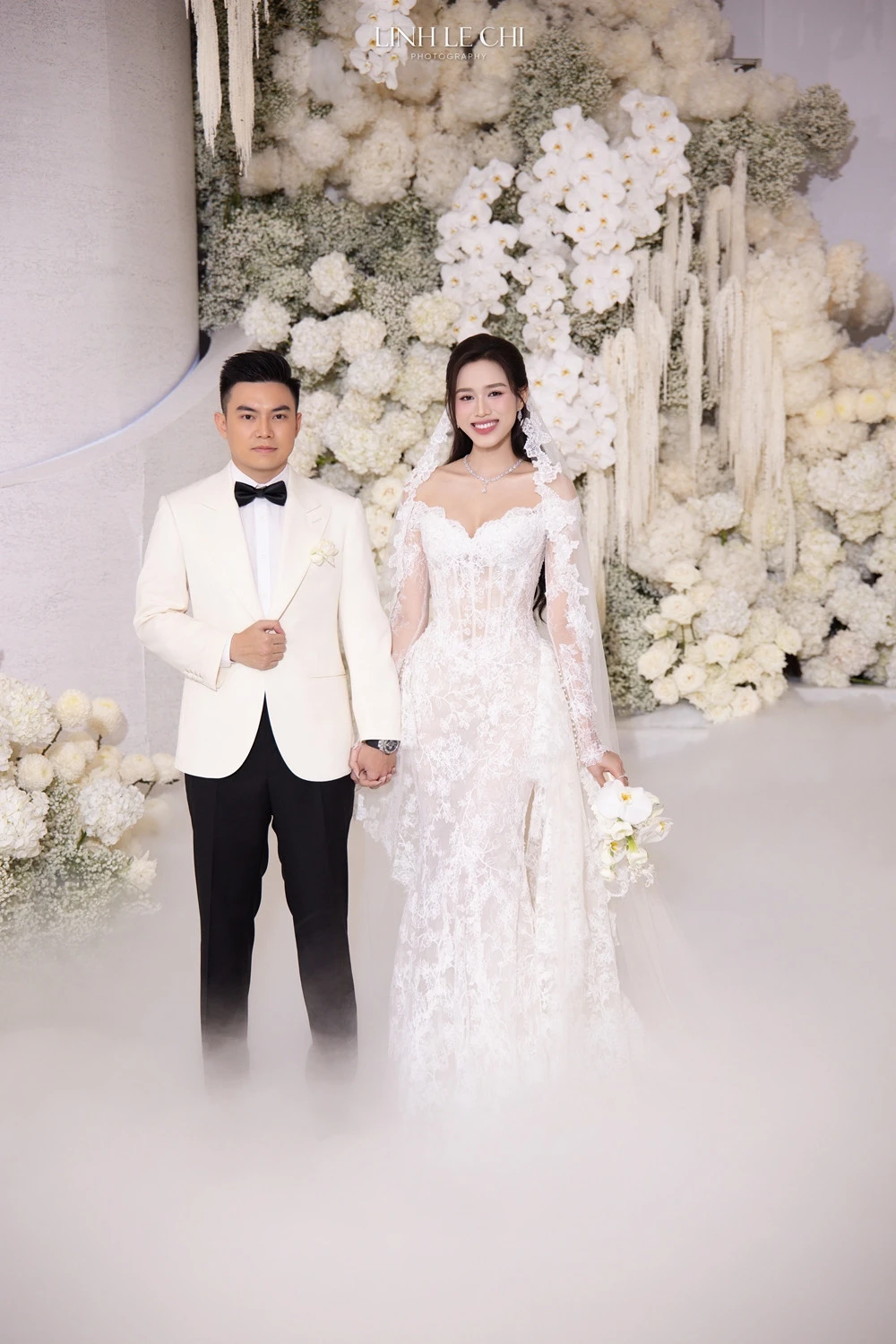 Hoa hậu Đỗ Thị Hà ‘dát kim cương’ bên chú rể, đám cưới như biển hoa trắng