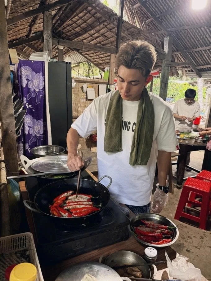 Jun Phạm đăng tải hình ảnh chăm chú làm bếp trong chương trình "Gia đình Haha", thu hút hàng chục nghìn lượt yêu thích. "Đi đâu, làm gì cũng về nhà bếp!", nam ca sĩ viết.