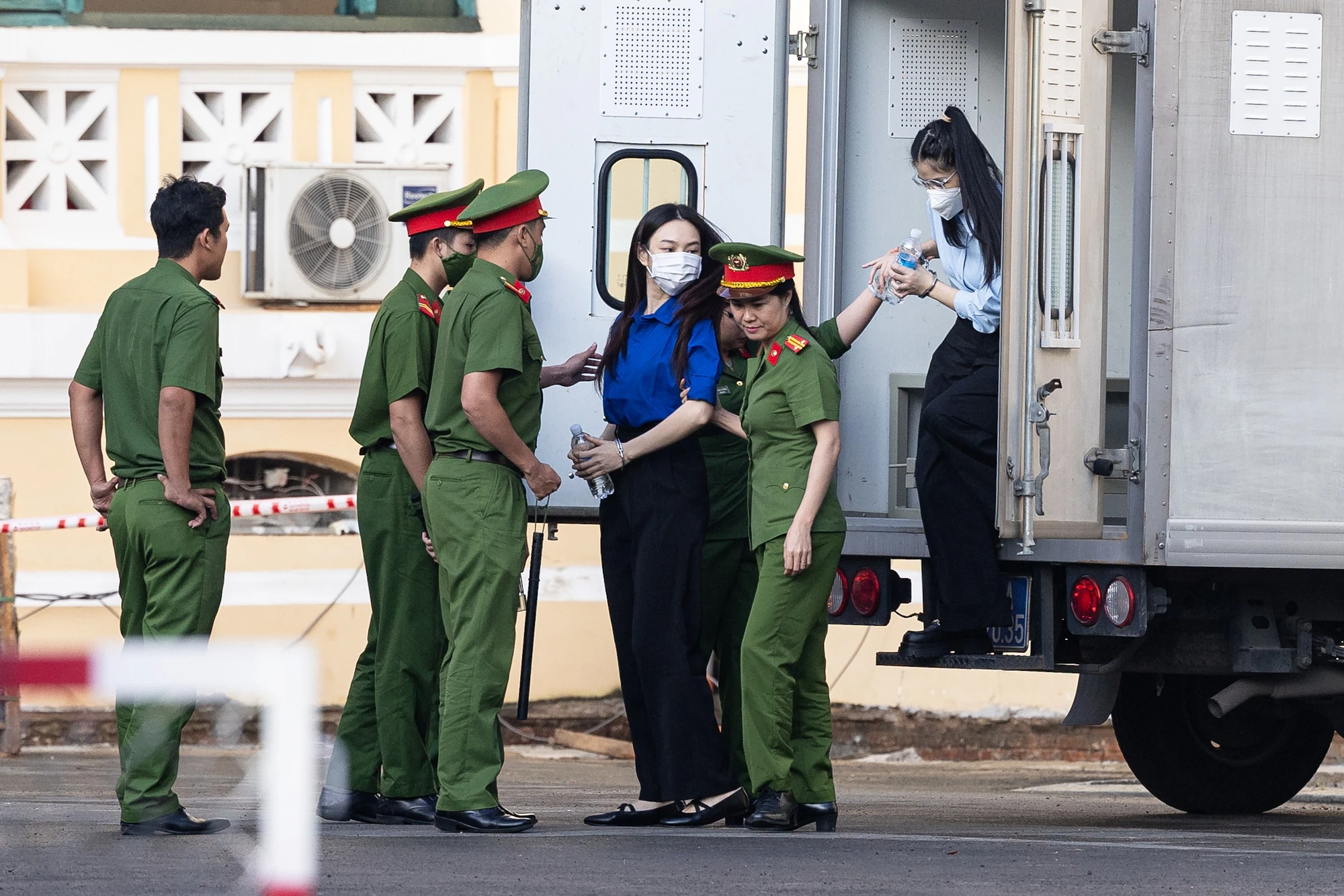 Cận cảnh Thuỳ Tiên bị còng tay áp giải đến toà, mặc áo màu xanh đặc biệt gây chú ý