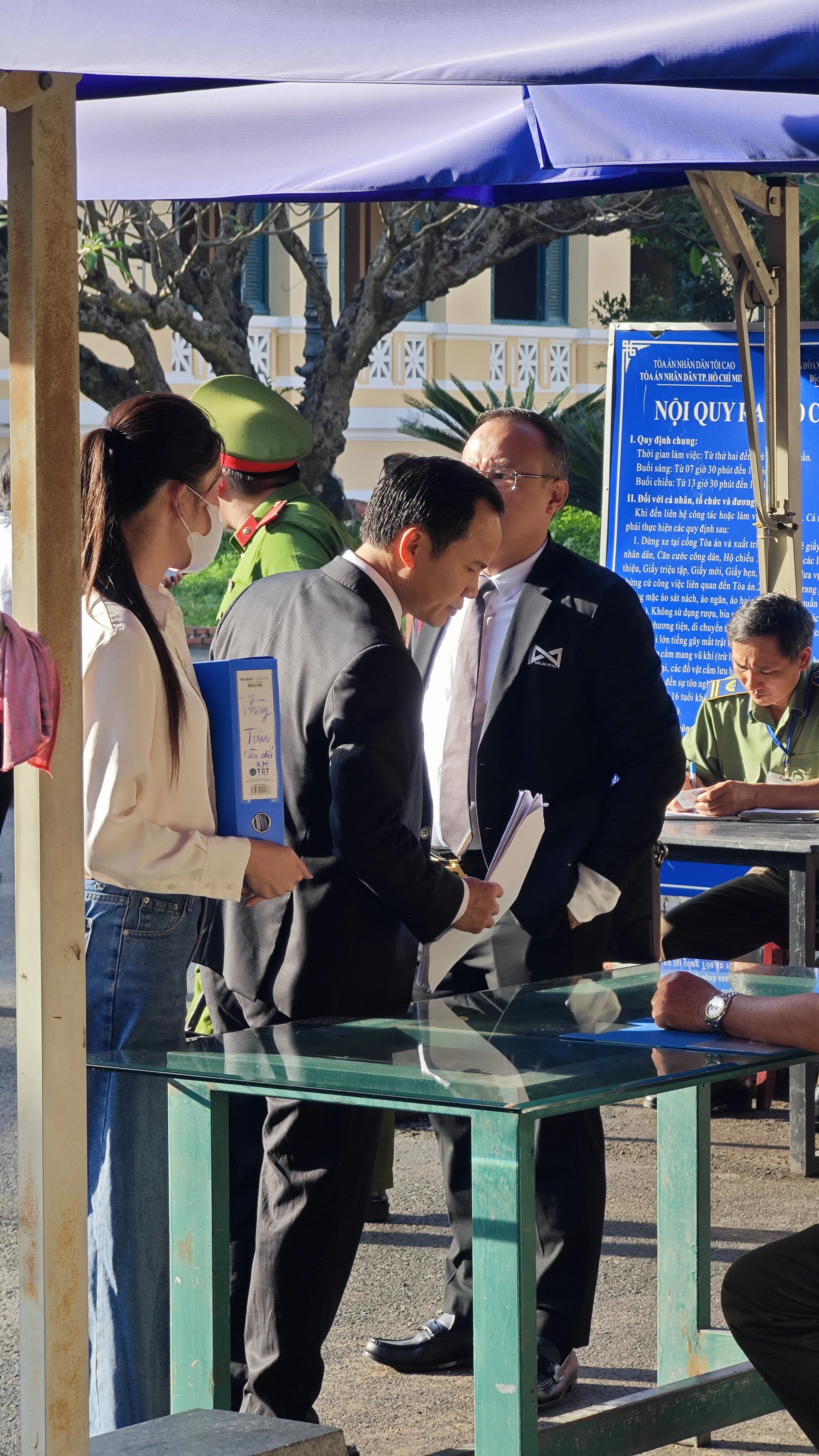 Hoa khôi Thuý Vi xuất hiện, cô làm thủ tục để vào bên trong phiên toà