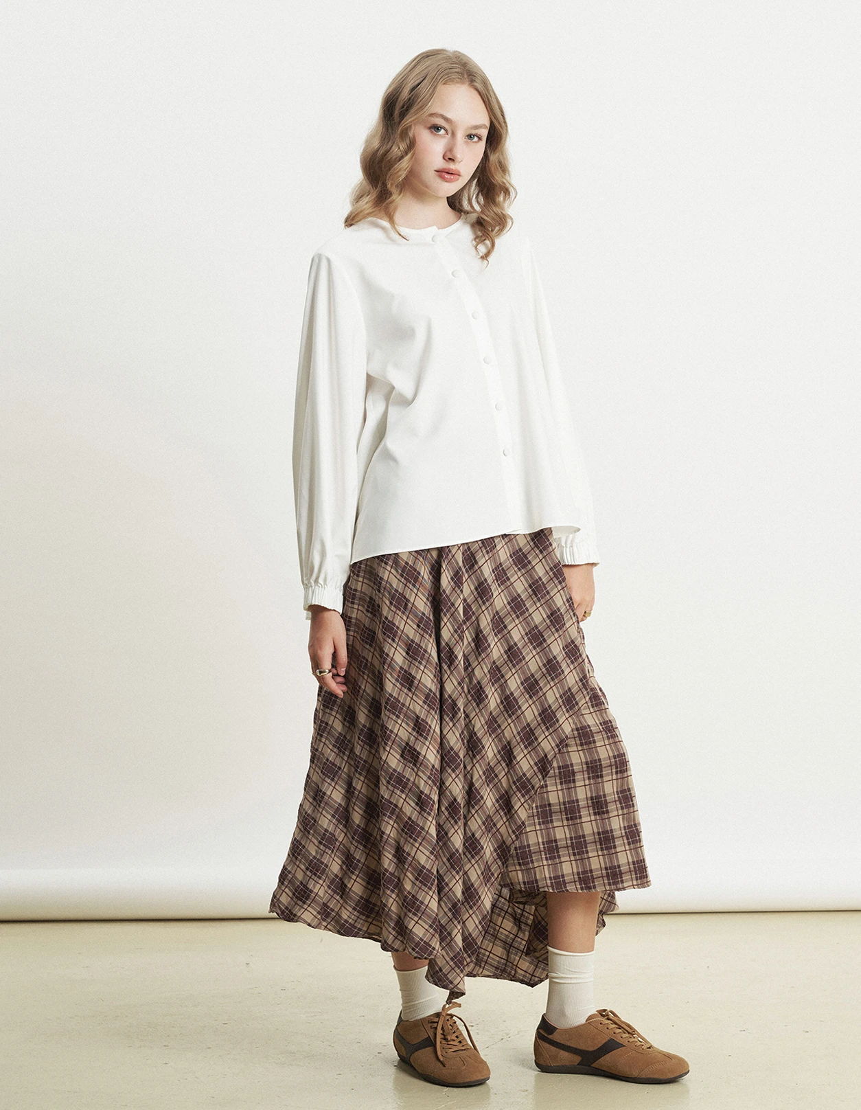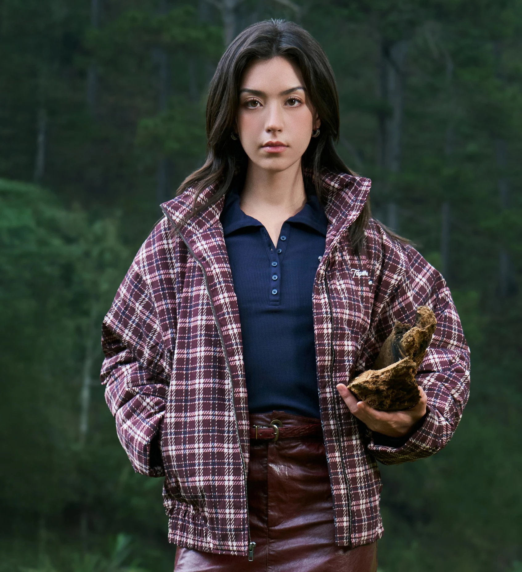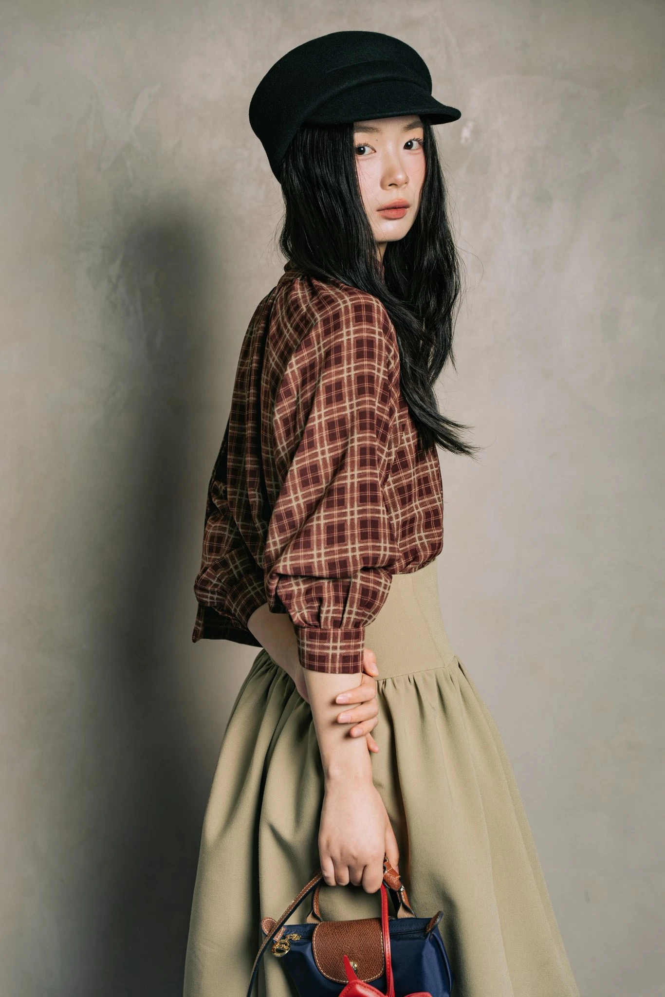 Không giống kiểu chân váy nữ sinh đặc trưng của các cô gái Hàn, Nhật, chân váy kẻ ca rô của thương hiệu Việt kết hợp nhiều yếu tố sáng tạo – từ phần vạt đắp đến độ dài midi, từ cấu trúc bất đối xứng đến cách phối cùng áo kiểu dáng rộng thoải mái