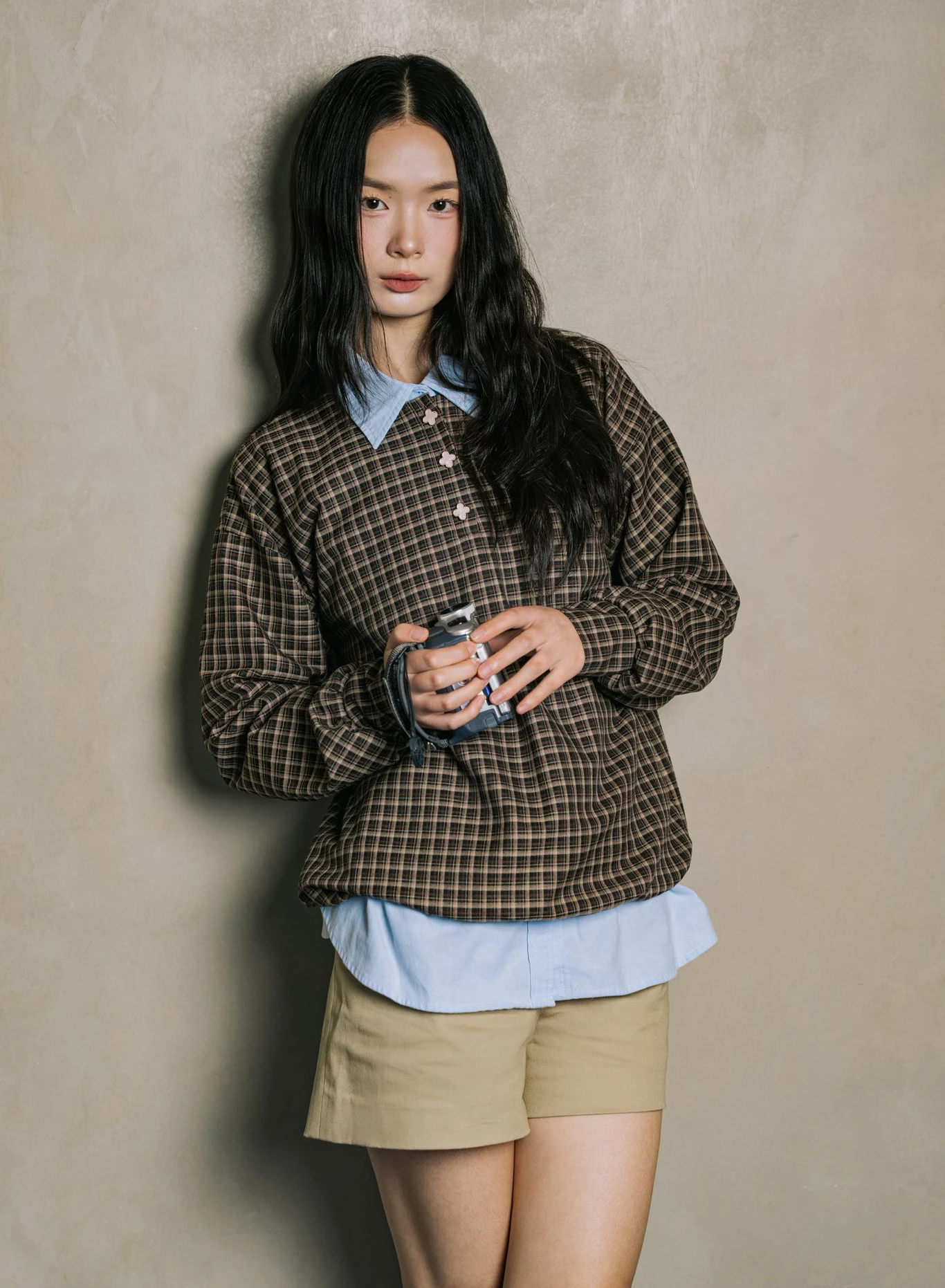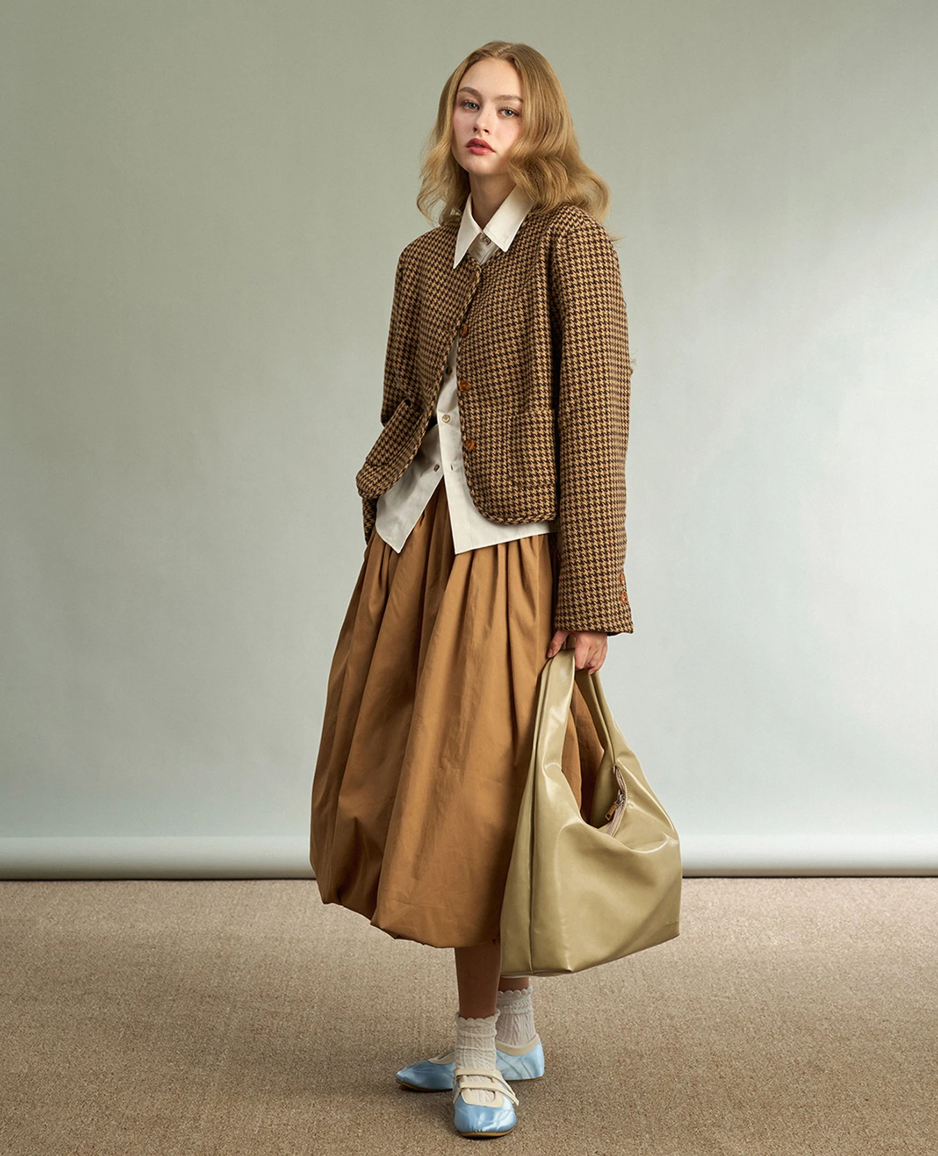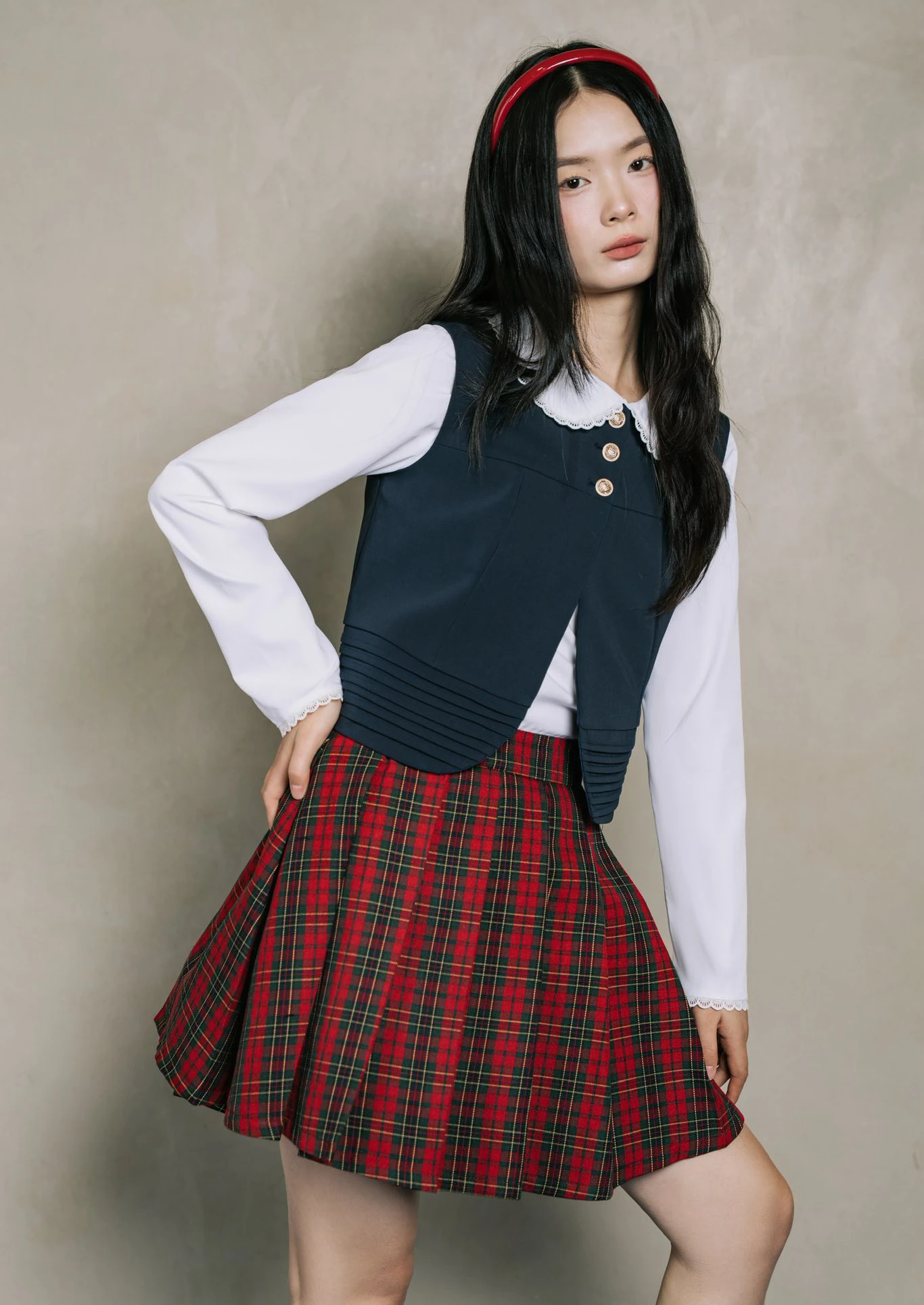 Không giống kiểu chân váy nữ sinh đặc trưng của các cô gái Hàn, Nhật, chân váy kẻ ca rô của thương hiệu Việt kết hợp nhiều yếu tố sáng tạo – từ phần vạt đắp đến độ dài midi, từ cấu trúc bất đối xứng đến cách phối cùng áo kiểu dáng rộng thoải mái