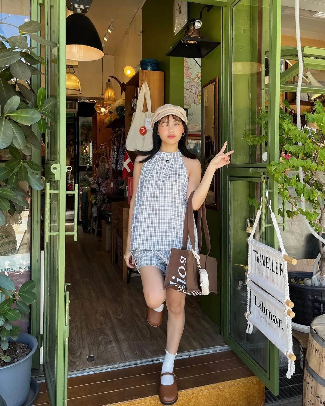 Để tạo sự khác biệt, bạn có thể thử nghiệm diện set trang phục ca rô với mũ nồi, kết hợp với giày mules hoặc sneakers trắng . ẢNH: @BBUBBLEBOOK