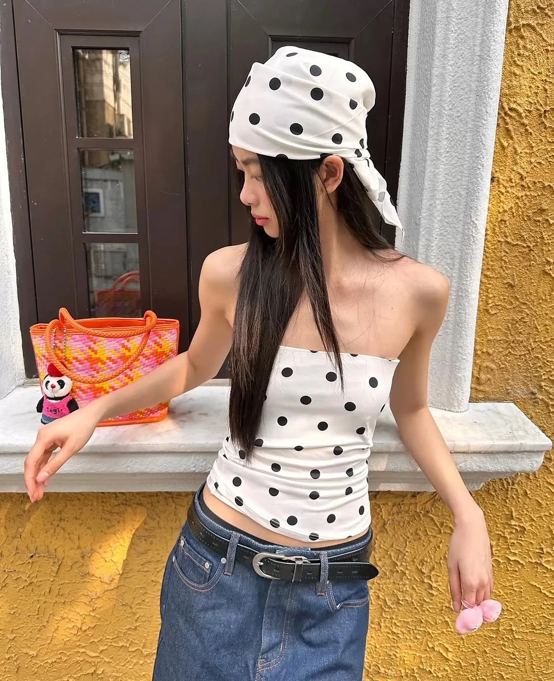 Để tăng độ phá cách, bạn có thể chọn áo chấm bi oversized phối cùng chân váy bút chì ôm sát, thêm một đôi xăng đan quai mảnh và túi tote da nhỏ. Điểm nhấn của chấm bi nằm ở sự linh hoạt như từ kích thước chấm nhỏ liêu xiêu cho vẻ ngoài vintage đến chấm lớn táo bạo cho phong cách hiện đại.
