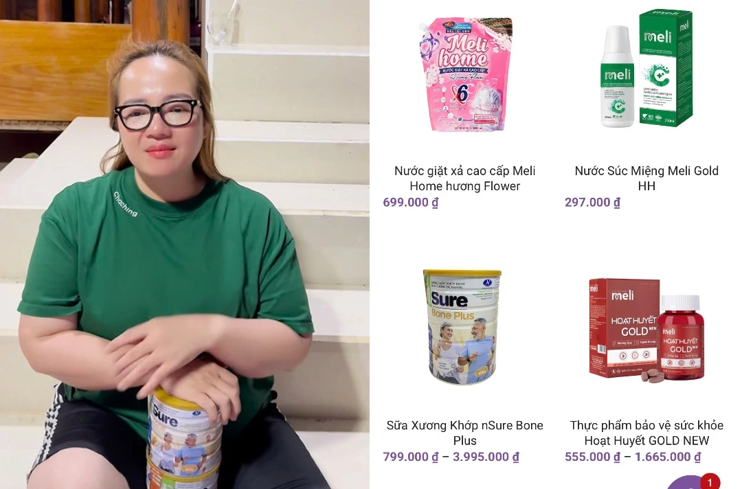 Hay các sản phẩm bảo vệ sức khỏe như hoạt huyết Gold New giá 555.000 đồng/hộp, nếu mua combo 3 hộp sẽ được tặng thêm 1 hộp giá 1,66 triệu đồng; nước súc miệng Meli Gold HH giá 297.000 đồng/hộp 3 chai; sữa xương khớp Sure Bone Plus giá 799.000 đồng/hộp; nội tiết tố nữ giá 699.000 đồng/hộp…