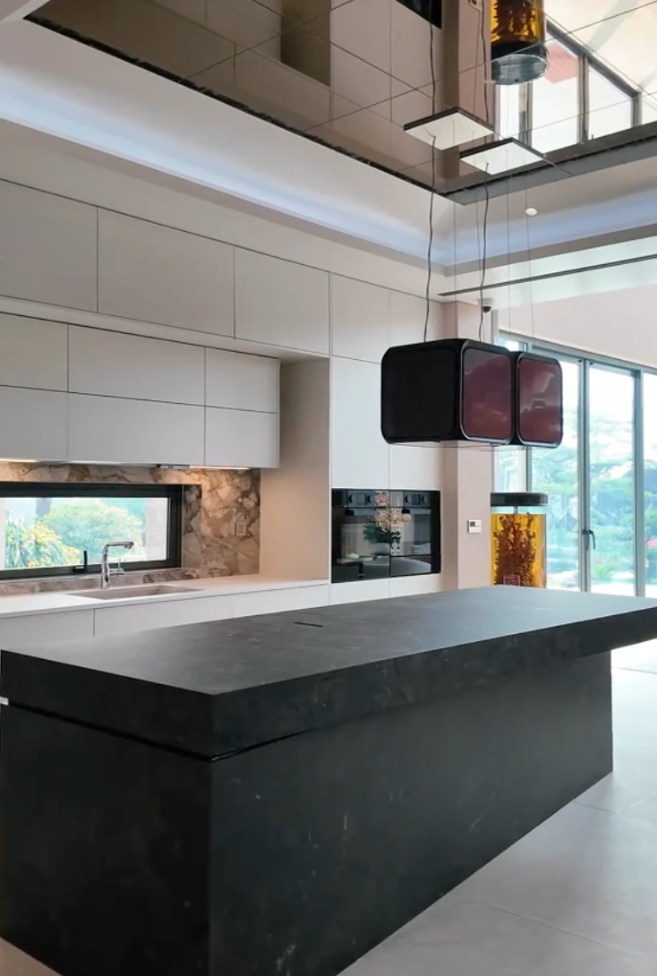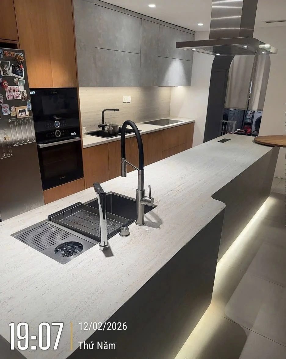 Nếu chỉ nhìn qua, nhiều người sẽ nghĩ khu vực bếp của Dino Vũ đơn giản chỉ là một mặt bàn đá lớn, phẳng lì và sạch sẽ. Không có vòng nhiệt, cũng không hề có bất kỳ dấu hiệu nào cho thấy đây là nơi dùng để nấu nướng. Thế nhưng, chính sự “vô hình” ấy lại là điểm đặc biệt nhất trong căn bếp mới của Vũ Dino.