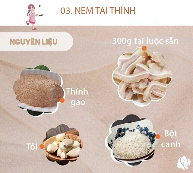 Nguyên liệu: 300g tai heo luộc chín, thái sẵn; 100g thính gạo; 1 muỗng cà phê nước mắm; 1 muỗng cà phê bột canh; 1 muỗng cà phê đường; 1 củ tỏi; 3 quả ớt; 5-7 lá chanh