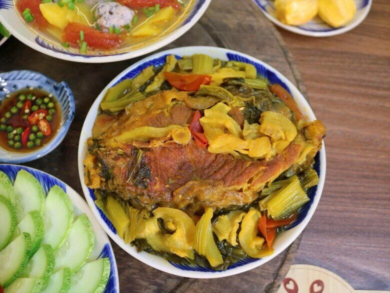 Mâm cơm hôm nay mang hương vị dân dã, thân thuộc, vừa đủ tinh tế để làm ấm lòng cả gia đình. Cá kho dưa chua đậm đà, béo ngậy xen lẫn vị chua dịu, đưa cơm đến lạ. Đĩa rau muống luộc xanh mướt, giòn ngọt, chấm cùng bát nước mắm tỏi ớt là chuẩn vị. Nem tai thính thơm bùi vừa miệng, ăn kèm lá sung, lá đinh lăng càng thêm tròn vị. Và không thể thiếu đậu phụ tẩm hành nóng hổi, mềm béo, giản dị mà ngon khó cưỡng. Tất cả hòa quyện tạo nên một bữa cơm đủ đầy, ấm áp, thân quen.