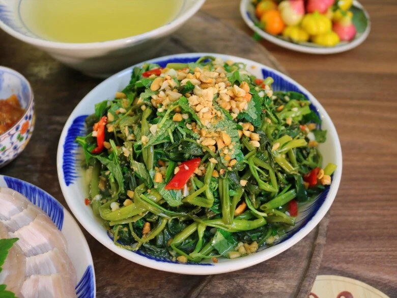 - Trộn đều nước trộn nộm với rau muống cùng 3 thìa muối vừng trước khi ăn khoảng 30 - 35 phút. Cho rau kinh giới và lạc rắc lên trên rồi thưởng thức.