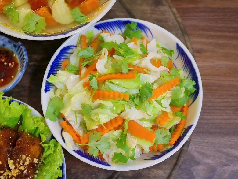 Mâm cơm hôm nay mang một cảm giác ấm cúng, quen thuộc của bữa ăn gia đình. Từ đĩa sườn chiên mắm tỏi thơm nức, miếng nào cũng đậm vị, đến đĩa bắp cải xào cà rốt giòn ngọt, thanh mát, tất cả hòa lại thành một bữa cơm cân bằng. Chả bì và nem chạo góp thêm chút hương vị dân dã, ăn kèm cơm trắng hay cuốn rau đều hợp. Bát canh khoai tây cà rốt hầm xương nóng hổi giúp mâm cơm, ngọt lành và dễ ăn, khiến bữa tối trở nên trọn vẹn và đủ chất cho cả nhà.