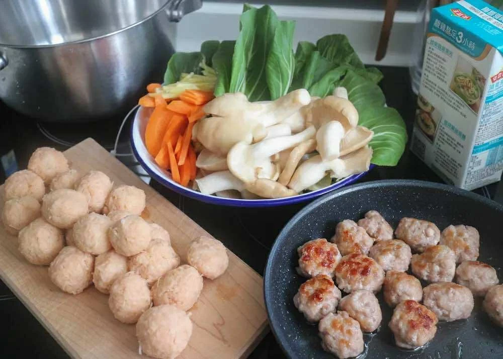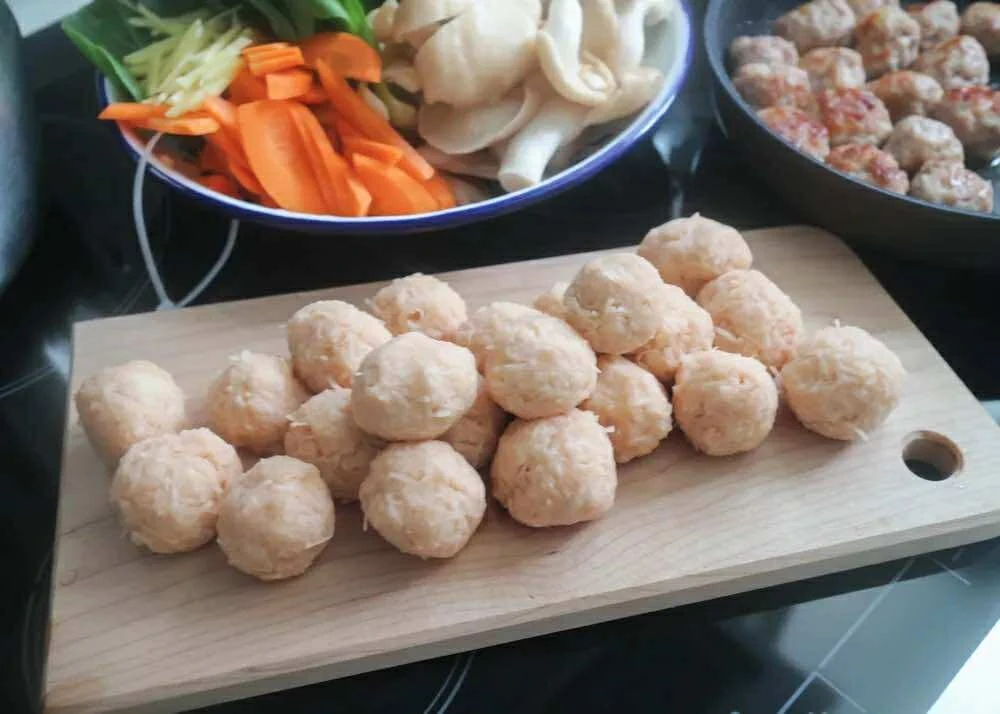 Bước 5: Tiếp theo bạn trộn thịt heo băm với một chút gia vị, dầu mè và bột bắp, thêm chút đường. Sau đó bạn vo thịt băm thành viên vừa ăn. Tiếp đó cho thịt viên vào áp chảo đến khi gần chín. Chuẩn bị một chiếc nồi, cho nước dùng gà và gừng thái lát mỏng vào, đun sôi. Tiếp đó bạn thả viên khoai tây vào, nấu trong khoảng 3 phút. Đến khi thấy viên khoai tây nổi lên mặt nước thì cho thịt viên và các loại rau củ vào. Nấu thêm khoảng 3 phút thì nêm nếm lại gia vị cho vừa ăn là hoàn thành.