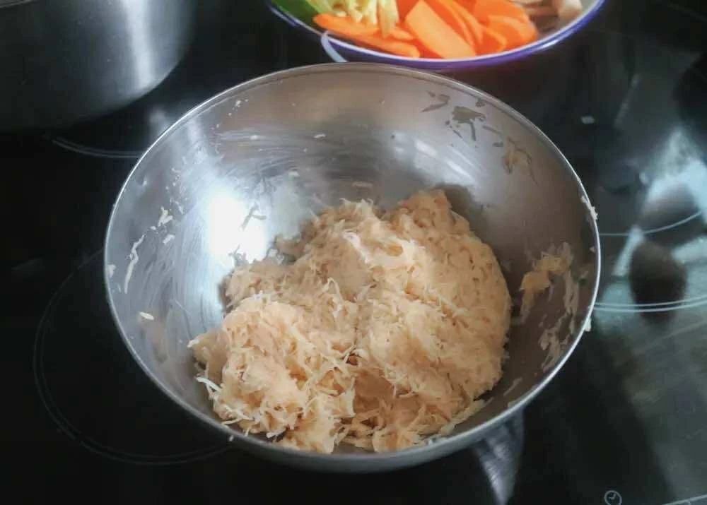 Bước 4: Phần sợi khoai tây bạn bọc trong vải, vặn chặt cho đến khi không còn nước. Sau đó cho vào âu, trộn đều với bột khoai tây. Nhào thật kỹ sau đó vo tròn thành những viên cỡ viên trứng cút hoặc viên cá chiên.