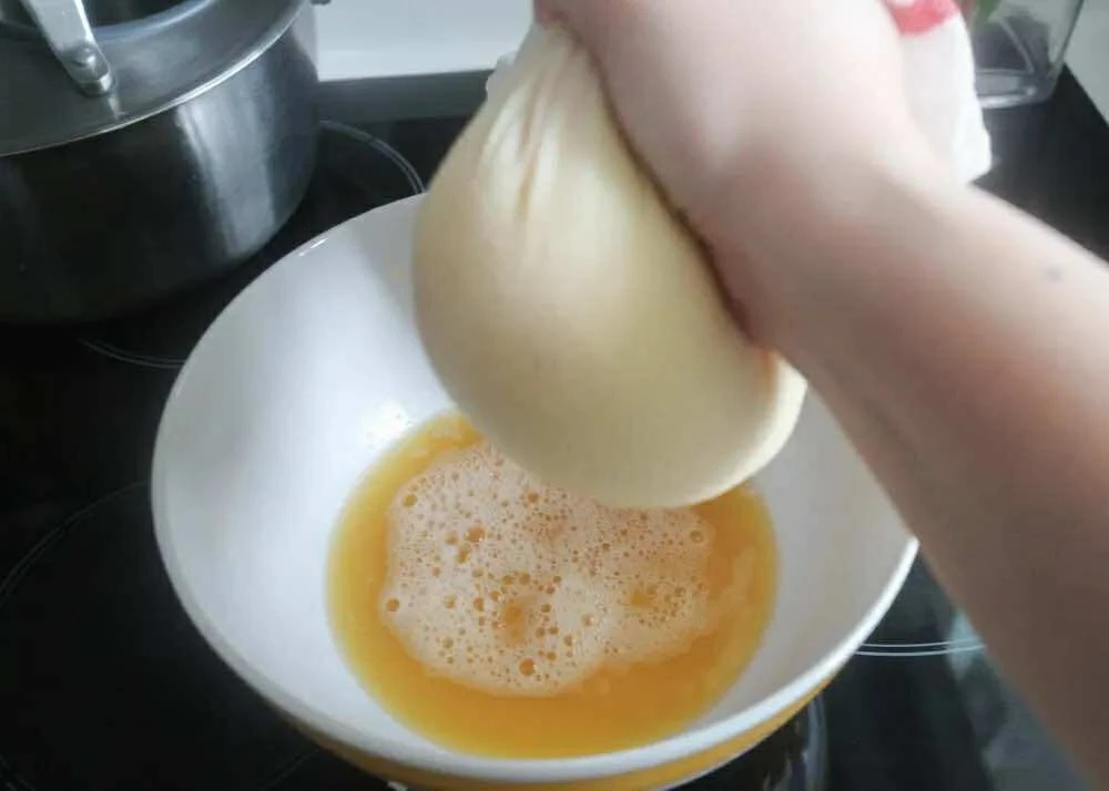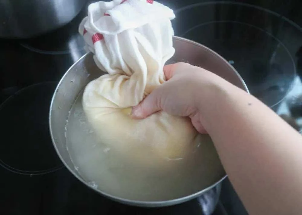 Bước 2: Tiếp theo bạn cho túi khoai tây vào một chậu với lượng nước vừa đủ. Bạn dùng tay chà/bóp mạnh vào túi để rửa phần tinh bột khoai tây. Bạn có thể lặp lại bước này một hoặc hai lần và cố gắng lấy được càng nhiều tinh bột càng tốt. Đổ toàn bộ phần nước vừa rửa khoai tây vào một âu lớn khác, để yên ít nhất 15 phút cho tinh bột lắng xuống.