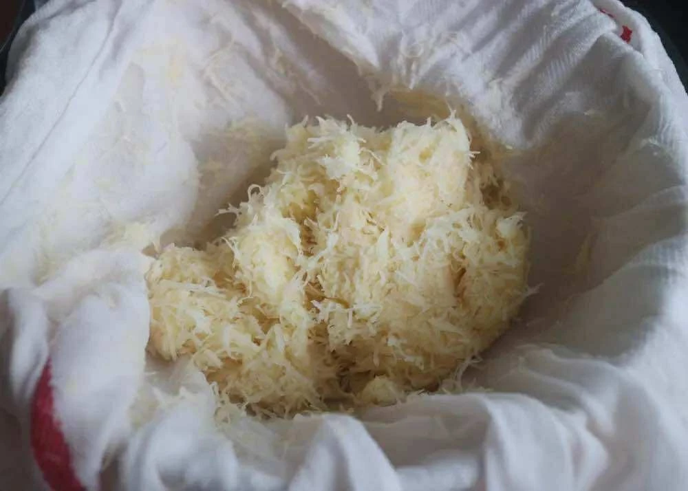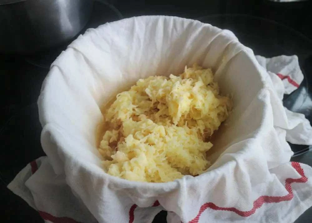 Bước 1: Trước tiên chúng ta hãy chuẩn bị cho phần viên khoai tây. Khoai tây bạn hãy gọt bỏ vỏ sau đó dùng dụng cụ bào sợi. Bào khoai tây thật mỏng và mịn cho đến khi gần như nghiền nát. Chuẩn bị một lớp khăn vải lớn, mỏng sau đó đặt lên bát to. Sau đó bạn cho khoai tây đã bào sợi vào, bọc lại. Tiếp đó bóp mạnh và ấn chặt để nước khoai thây chảy vào bát.