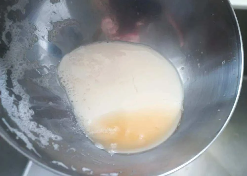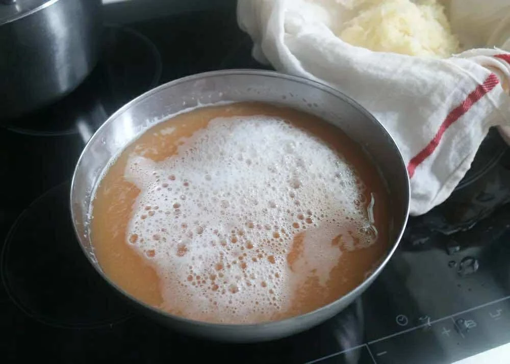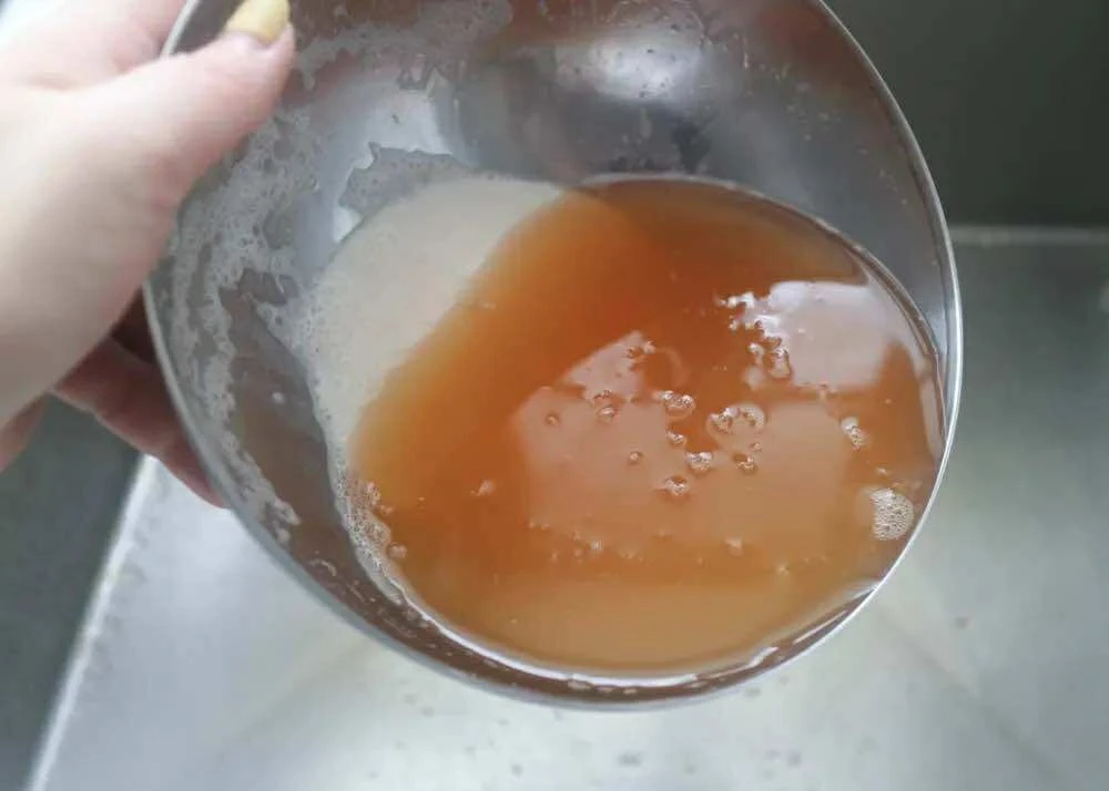 Bước 3: Sau một khoảng thời gian, tinh bột khoai tây sẽ lắng xuống. Bạn cẩn thận gạn phần nước màu hồng ở trên đi. Từ từ bạn sẽ thấy lớp tinh bột khoai tây màu trắng ở bên dưới.