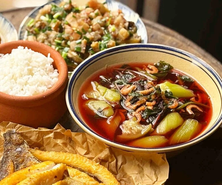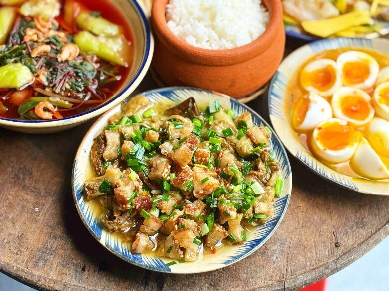 Mâm cơm hôm nay mang đậm hương vị dân dã với những món ăn giản dị nhưng vô cùng đưa cơm. Cà tím nướng mỡ hành tóp mỡ béo bùi thơm lừng, kết hợp cùng canh rau dền mướp xanh nấu tôm khô mát lành, thanh nhẹ. Bên cạnh đó là khô cá lóc chiên giòn rụm, khô cá sặc bóp xoài chua ngọt hấp dẫn, và thêm chút trứng luộc dầm mắm ớt cay nồng. Tất cả hòa quyện, giản dị mà tròn vị.