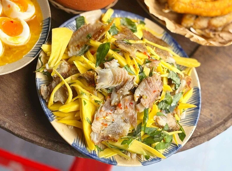 Chuẩn bị: 300g khô cá sặc 1 nắng, 1 quả xoài xanh (có độ chua vừa phải), một nắm rau răm. Gia vị: Nước mắm, đường, chanh, ớt.