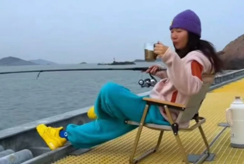 Yue Li đang ngồi câu cá, nhâm nhi một cốc cà phê nóng hổi.