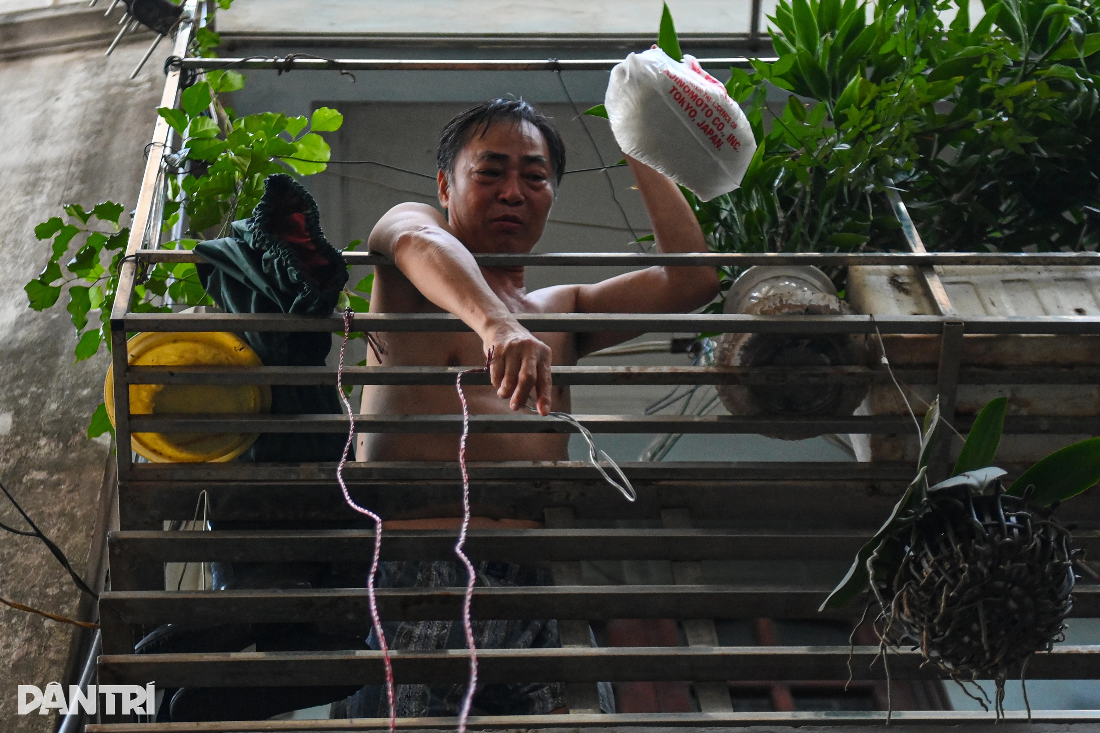 Nghe chị Hà gọi, ông Toàn liền ra ban công, ném một sợi dây buộc sẵn qua ban công xuống dưới ngõ, chị Hà cẩn thận buộc túi cơm để ông Toàn kéo lên tầng 2.