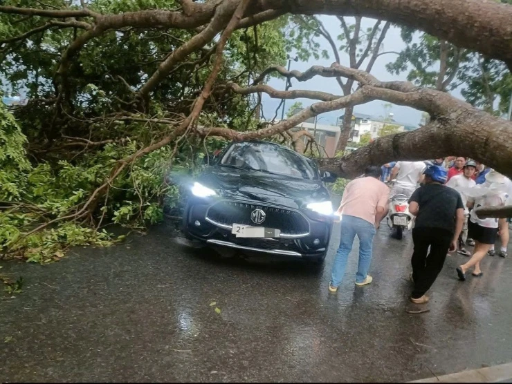 Cây đổ trong mưa dông làm đứt dây điện, đè hư hỏng một số ô tô.