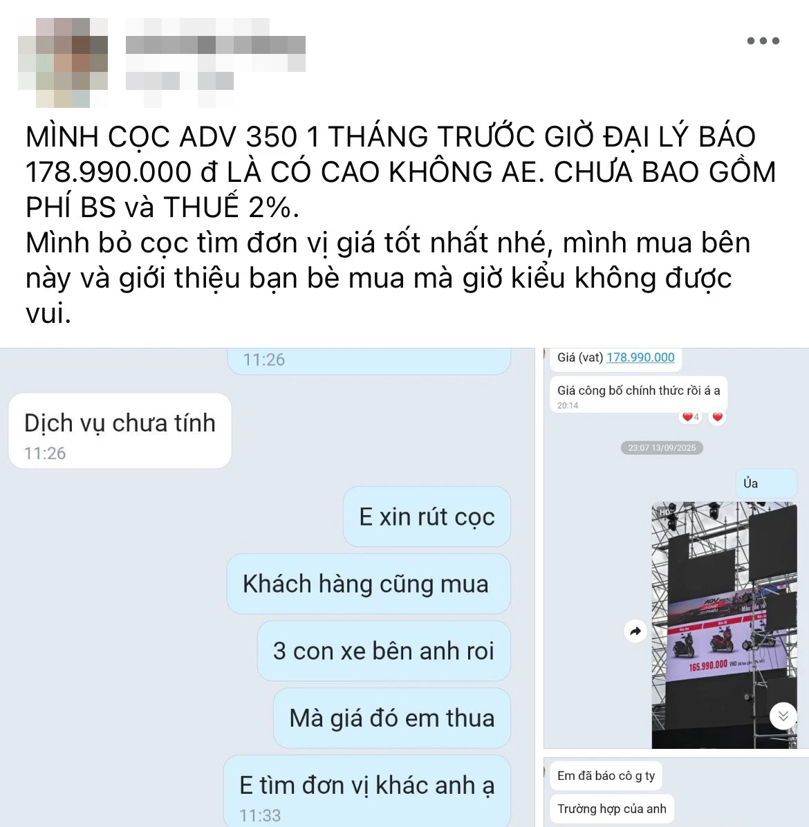 Một khách đã đặt cọc mua Honda ADV 350 than phiền vì giá bán thực tế bị đội lên khá cao so với giá niêm yết . ẢNH: CHỤP MÀN HÌNH