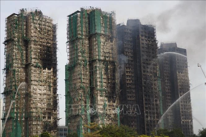 Hiện trường vụ cháy chung cư ở Tai Po, Hong Kong (Trung Quốc). Ảnh: THX/TTXVN