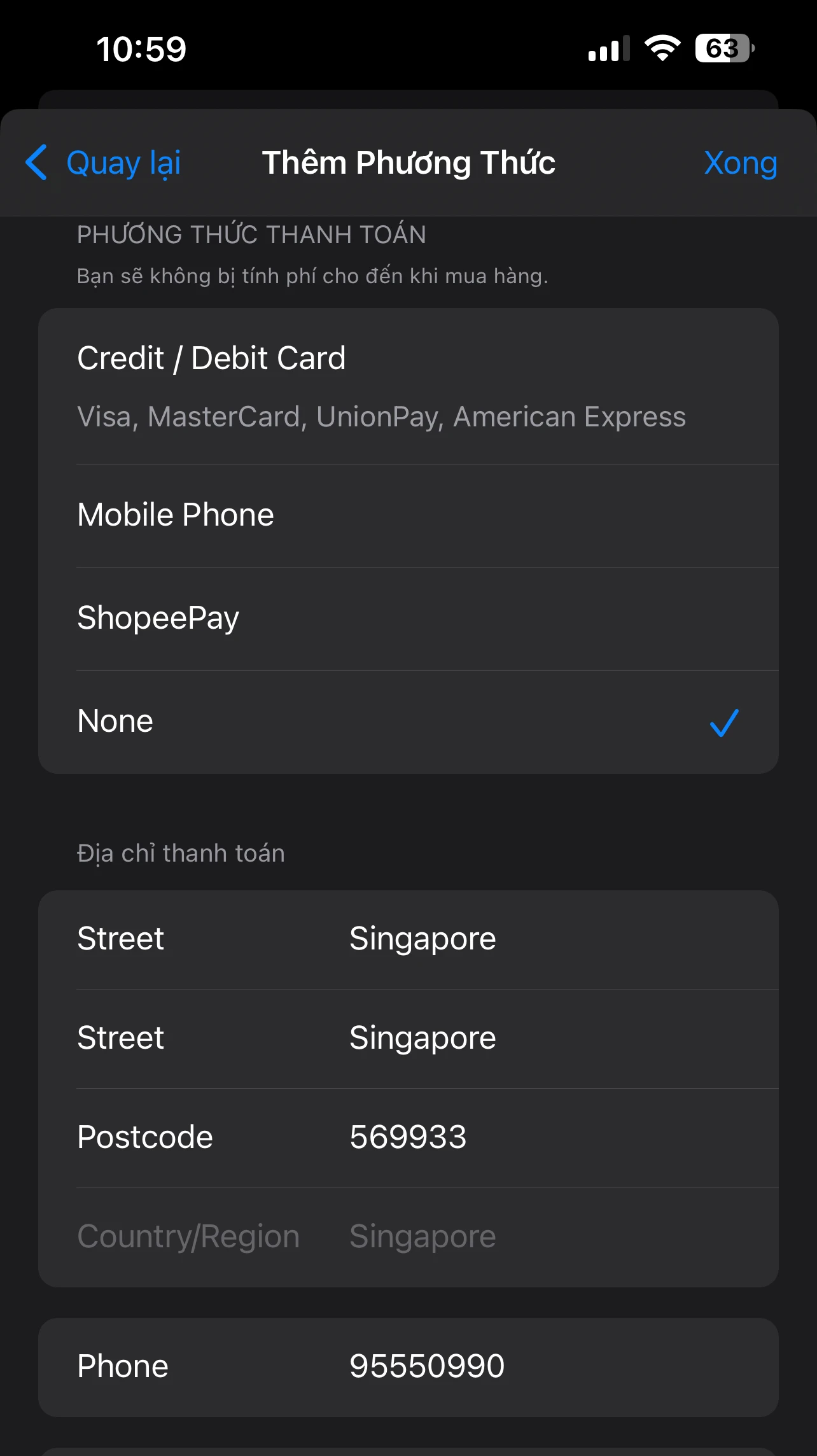Bước 2: Chọn “Quốc gia/ Vùng” “Singapore”