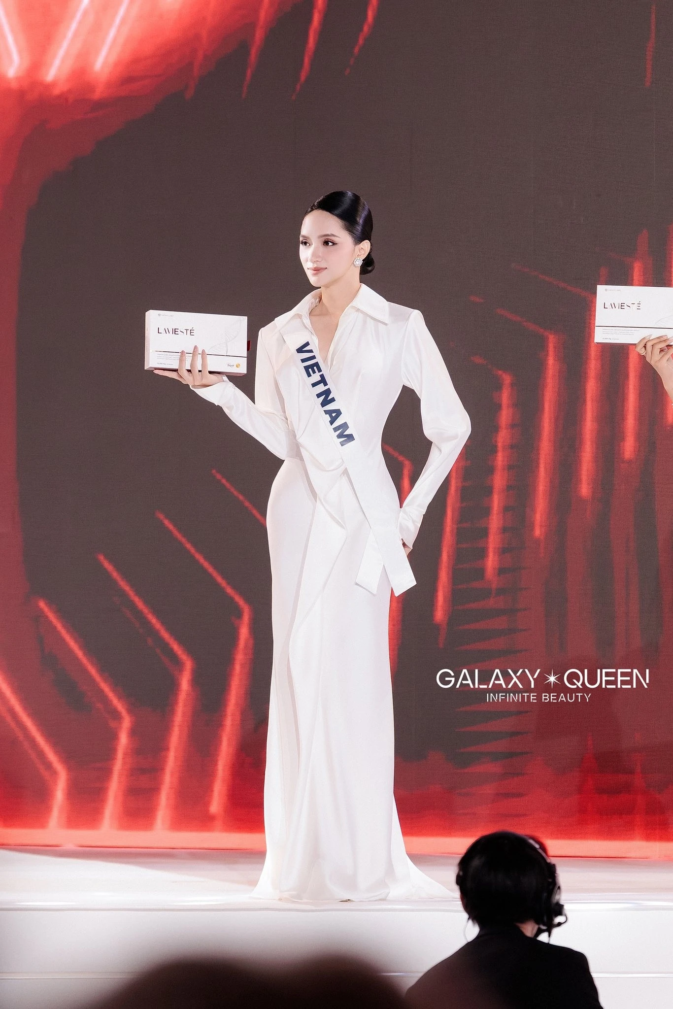 Đại diện Việt Nam chọn trang phục tông trắng trang nhã, kết hợp với phong cách trang điểm nhẹ.