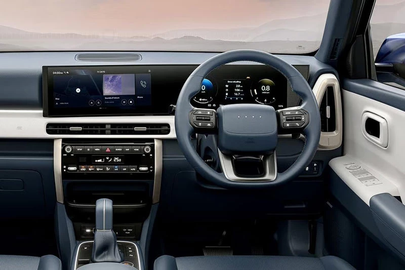 Bên trong, Hyundai Venue 2026 được tái thiết kế toàn diện, lấy cảm hứng từ dòng xe điện Ioniq. Tâm điểm là cụm màn hình đôi 12,3 inch liền khối trong mặt kính cong, bao gồm bảng đồng hồ kỹ thuật số và màn hình giải trí trung tâm. Bố cục tinh gọn, hiện đại, kết hợp các nút bấm vật lý giúp thao tác thuận tiện khi di chuyển.