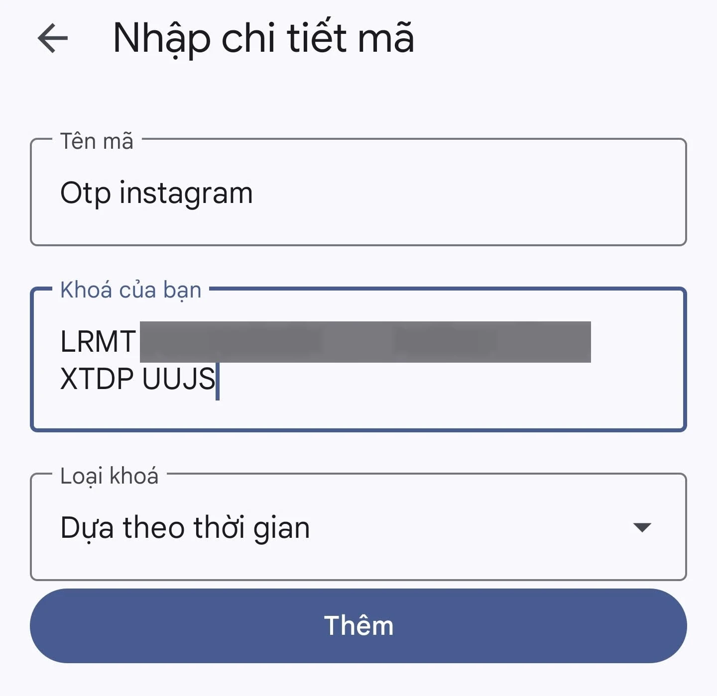 Sau khi cài đặt và kích hoạt ứng dụng Google Authenticator, bạn nhấn vào biểu tượng dấu ” ” trên giao diện chính của ứng dụng này, chọn “Nhập khóa thiết lập”. Tại mục tên mã, bạn có thể đặt tên bất kỳ (chẳng hạn OTP Instagram), sau đó copy đoạn mã khóa trên ứng dụng Instagram, dán vào khung “Khóa của bạn” và nhấn nút “Thêm”.