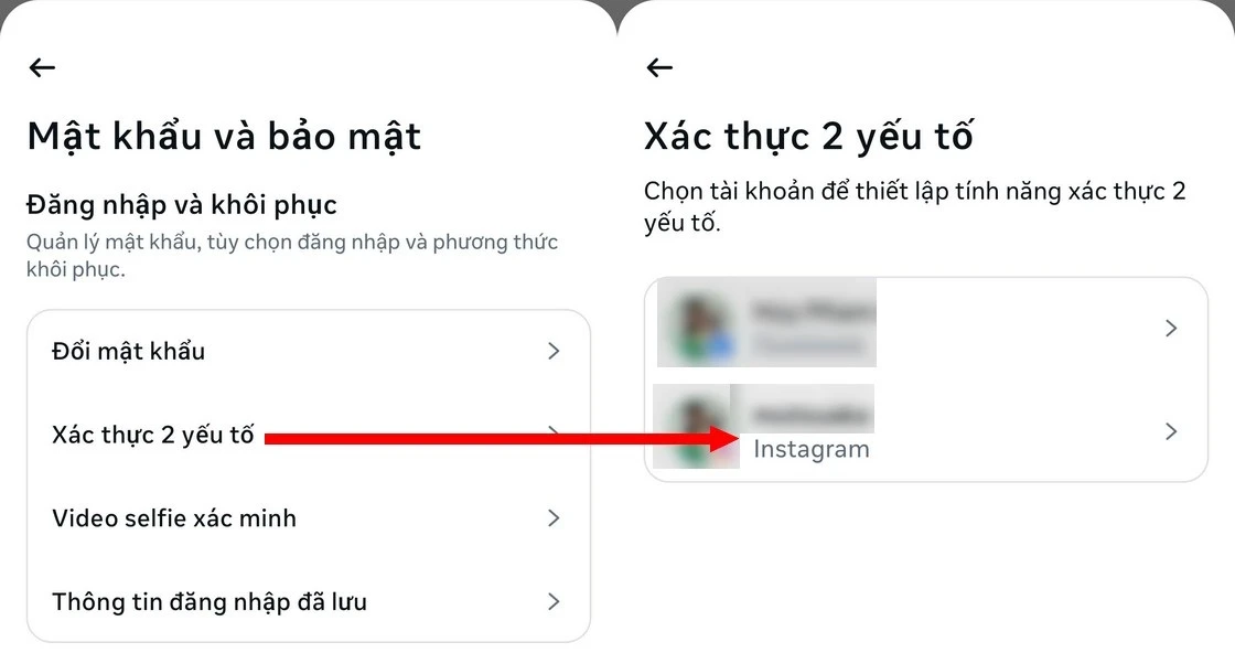 – Tại giao diện tiếp theo, chọn “Xác thực 2 yếu tố”, chọn tiếp tài khoản Instagram từ danh sách hiện ra.