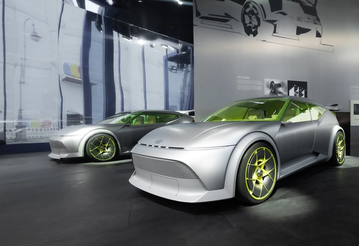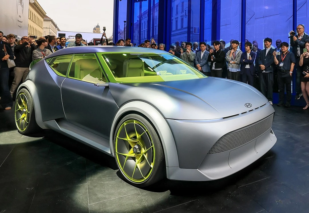 Bên trong, Hyundai phá vỡ lối mòn với khoang lái không màn hình cảm ứng lớn. Thay vào đó, người lái có thể mang thiết bị riêng để gắn lên bảng điều khiển, tùy chỉnh trải nghiệm. Ghế ôm thân bọc vải tái chế từ rác thải đại dương, bề mặt nội thất phối vàng chanh - xám nhẹ, kết hợp bột nhôm siêu nhẹ, mang tính bền vững cao.