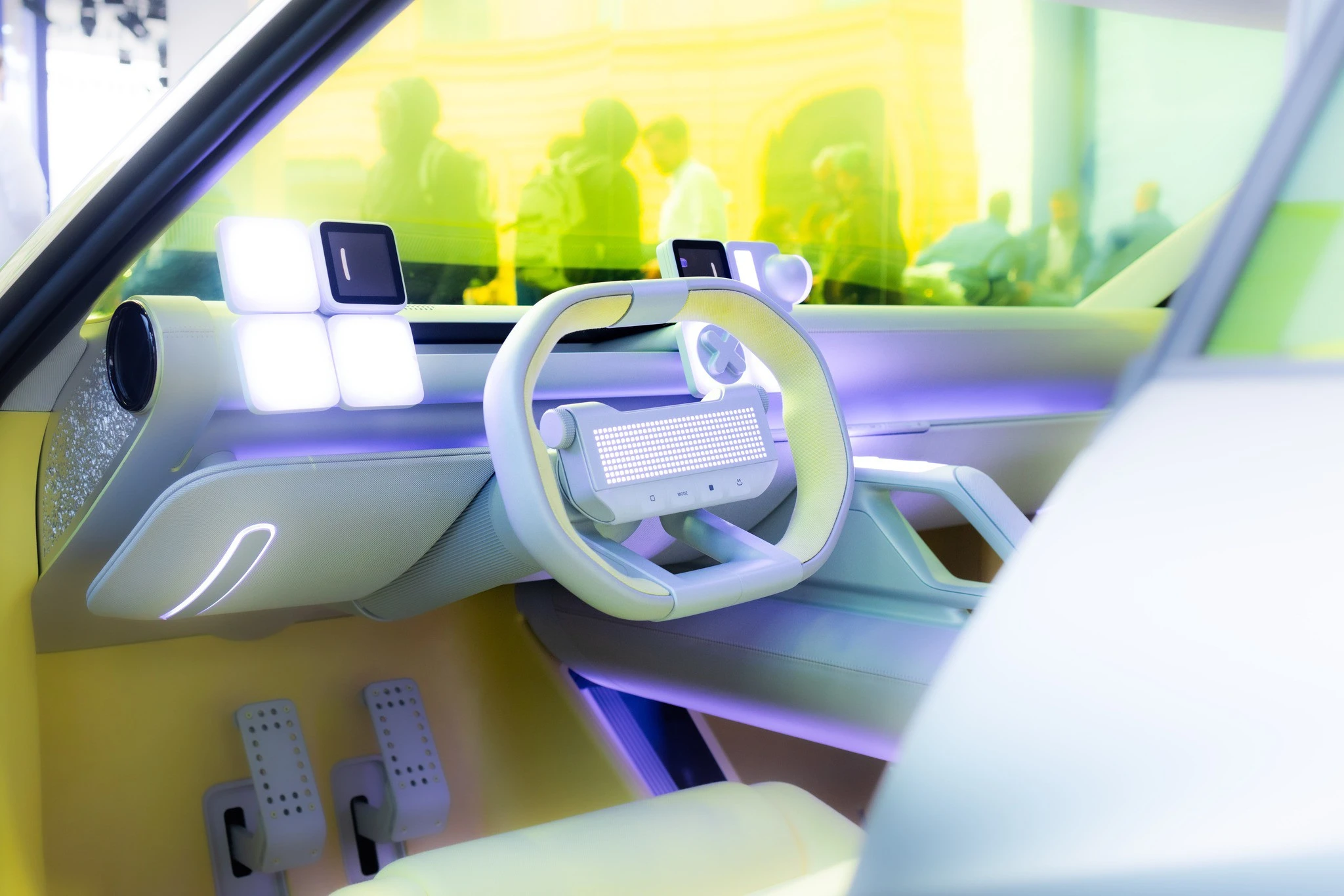 Các chi tiết như kính màu chanh bao quanh xe và bộ mâm cùng tông màu càng làm nổi bật vẻ ngoài táo bạo của mẫu xe hatchback chạy điện này.