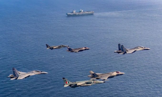 Biên đội Su-30, Jaguar mô phỏng tập kích tàu sân bay và không chiến tầm gần với biên đội F-35 Anh trong cuộc diễn tập ngoài khơi Ấn Độ.