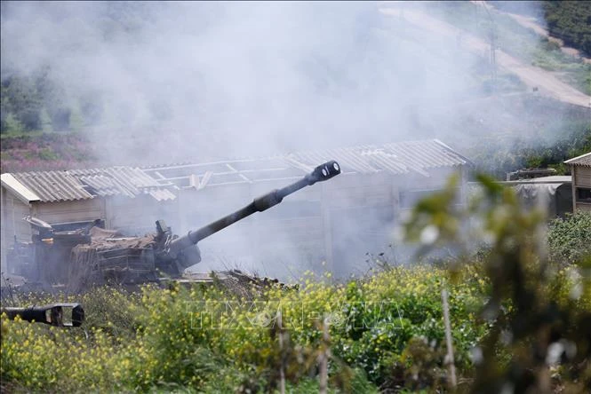 Pháo binh Israel phóng hoả lực xuống khu vực miền Nam Liban ngày 27/3/2026. Ảnh: THX/TTXVN