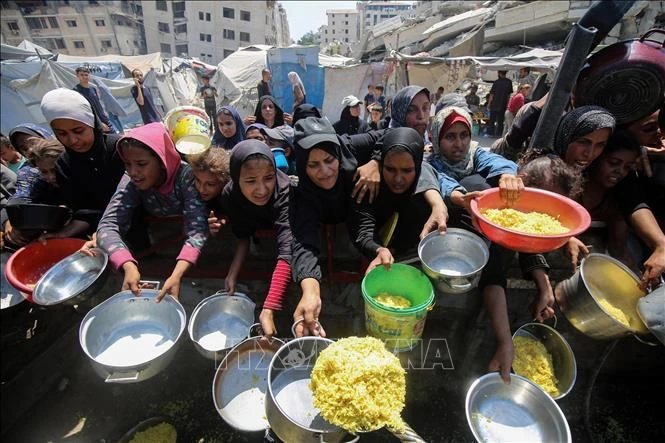 Người dân Palestine chờ được phát thực phẩm cứu trợ tại Gaza. Ảnh: THX/TTXVN