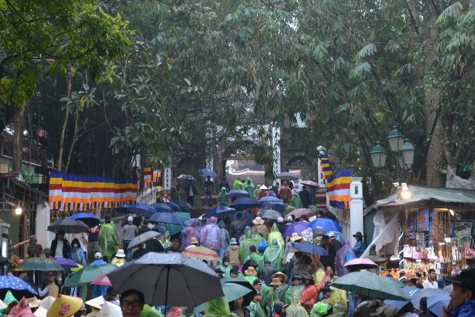 Du khách đội mưa đổ về khai hội chùa Hương sáng 22/2. Ảnh: BTC.