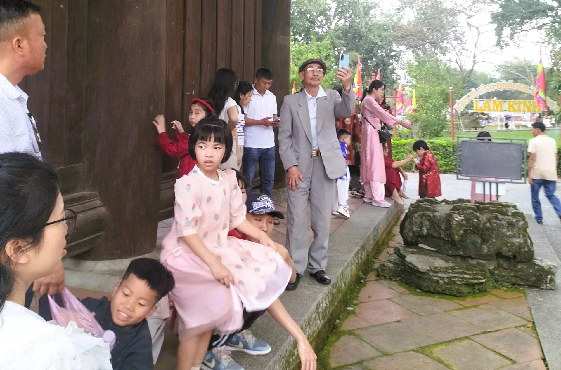 Người dân, du khách vui chơi, check-in trong khu vực sân rồng trước Chính điện Lam Kinh