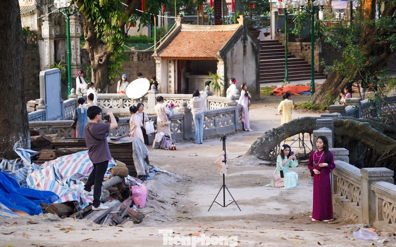 Khác với sự ồn ào của các điểm du lịch nổi tiếng, đền Voi Phục gần đây nổi lên như một "tọa độ check-in" kín tiếng trong cộng đồng trẻ. Không gian rêu phong, những mảng tường gạch cũ và hàng cây già đổ bóng tạo nên phông nền hoàn hảo cho những bộ ảnh áo dài mang phong cách nhẹ nhàng, trầm mặc.